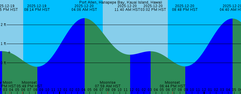 2025-12-19 02:25 PM HST 0.62 feet High Tide 2025-12-19 03:44 PM HST New Moon 2025-12-19 05:49 PM HST Moonset 2025-12-19 05:59 PM HST Sunset 2025-12-19 08:14 PM HST -0.21 feet Low Tide 2025-12-20 04:06 AM HST 2.35 feet High Tide 2025-12-20 07:12 AM HST Sunrise 2025-12-20 07:59 AM HST Moonrise 2025-12-20 11:40 AM HST 0.43 feet Low Tide 2025-12-20 03:02 PM HST 0.61 feet High Tide 2025-12-20 06:00 PM HST Sunset 2025-12-20 06:44 PM HST Moonset 2025-12-20 08:48 PM HST -0.19 feet Low Tide 2025-12-21 04:40 AM HST 2.33 feet High Tide 2025-12-21 07:12 AM HST Sunrise 2025-12-21 08:47 AM HST Moonrise 2025-12-21 12:16 PM HST 0.41 feet Low Tide 2025-12-21 03:41 PM HST 0.60 feet High Tide 2025-12-21 06:00 PM HST Sunset 2025-12-21 07:40 PM HST Moonset 2025-12-21 09:22 PM HST -0.14 feet Low Tide 2025-12-22 05:15 AM HST 2.29 feet High Tide 2025-12-22 07:13 AM HST Sunrise 2025-12-22 09:30 AM HST Moonrise 2025-12-22 12:54 PM HST 0.39 feet Low Tide 2025-12-22 04:28 PM HST 0.58 feet High Tide 2025-12-22 06:01 PM HST Sunset 2025-12-22 08:37 PM HST Moonset 2025-12-22 09:57 PM HST -0.05 feet Low Tide 2025-12-23 05:50 AM HST 2.21 feet High Tide 2025-12-23 07:13 AM HST Sunrise 2025-12-23 10:10 AM HST Moonrise 2025-12-23 01:34 PM HST 0.34 feet Low Tide |